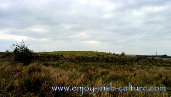 Rathcroghan mound seen below is accessible from a car park located 4km on the Westport side of Tulsk. Climb to the top of the hill. Find the ‘dents’ in the hillside, these are the ancient processional routes. Imagine the place as it would have been, with seven rings of tall wooden palisades!