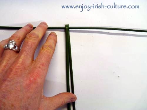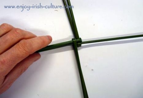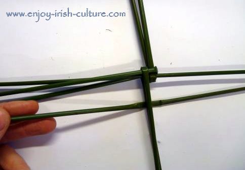Now pick the first two rushes and lay them down on the table making a cross as seen above on the right.