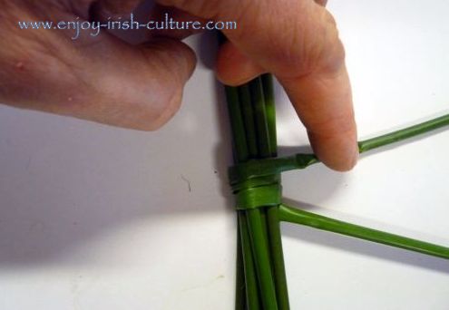 Keeping the centre of the cross secure with your fingertips, place another rush under the bottom portion and repeat the process as before, always folding around to the right and rotating the cross clockwise by one quarter.